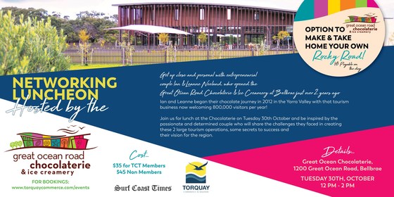 Get up close and personal with entrepreneurial couple Ian & Leanne Neeland, who opened the Great Ocean Road Chocolaterie & Ice Creamery at Bellbrae just over 2 years ago. Ian and Leanne began their chocolate journey in 2012 in the Yarra Valley with that tourism business now welcoming 800,000 visitors per year! Join us for lunch at the Chocolaterie on Tuesday 30th October and be inspired by the passionate and determined couple who will share the challenges they faced in creating these 2 large tourism operations, some secrets to success and their vision for the region. Option to make and take home your own rocky road! $8 payable on the day. We look forward to seeing you there!  Any enquiries, please email us Not a member?  It's easy; join here.