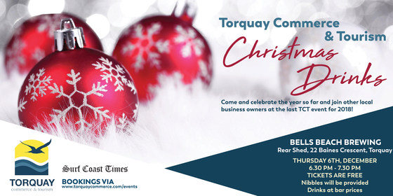 Come and celebrate the year so far and join other local business owners at the last TCT event for 2018! @ Bells Beach Brewing, Rear Shed, 22 Baines Crescent, Torquay Thursday 6th December 2018 6:30pm - 7:30pm Nibbles will be provided, drinks at bar prices Thanks to Surf Coast Times for their ongoing support throughout 2018. If you wish to become a Torquay Commerce and Tourism member, please click here.