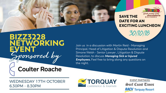 If you’ve ever had sick or injured employees and weren’t sure what to do...this night is for you! Join us in a discussion with Martin Reid - Managing Principal, Head of Litigation & Dispute Resolution and Simone Welsh - Senior Lawyer , Litigation & Dispute Resolution, to discuss Managing Sick or Injured Employees.  If you are a current Torquay Commerce and Tourism member it is FREE to come along. If you aren't a member yet, no problem! You are still welcome to join us for $25 per person.  We are looking forward to a great night of networking with all our local businesses. Please remember to bring along your cards AND your questions! This BIZZ3228 event is proudly sponsored by Coulter Roache. Many thanks to our event sponsors: RACV Torquay Resort and Surf Coast Times. Not a member?  It's easy - join here. If you have any further questions, please email us.